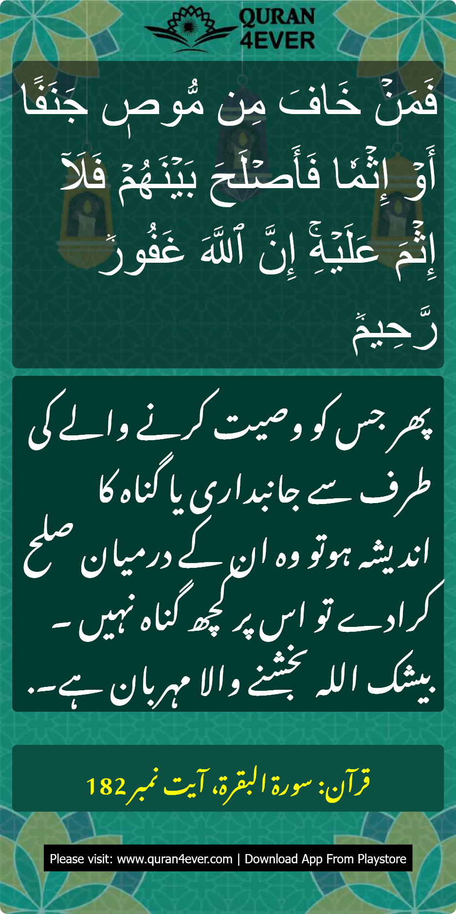 ترجمہ: پھر جس کو وصیت کرنے والے کی طرف سے جانبداری یا گناہ کا اندیشہ ہوتو وہ ان کے درمیان صلح کرادے تو اس پر کچھ گناہ نہیں ۔ بیشک اللہ بخشنے والا مہربان ہے۔