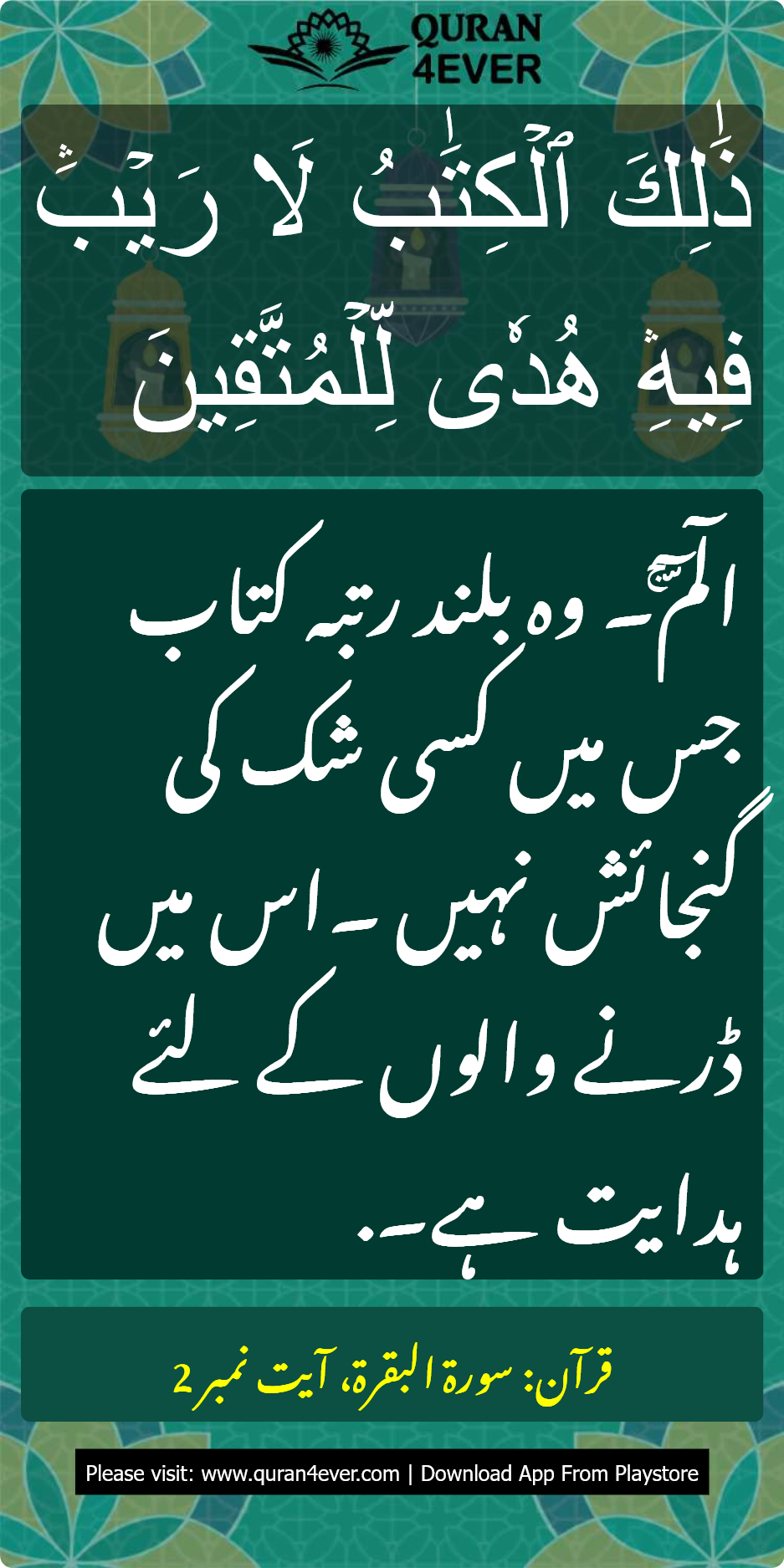 ترجمہ: الٓمّٓۚ۔ وہ بلند رتبہ کتاب جس میں کسی شک کی گنجائش نہیں ۔اس میں ڈرنے والوں کے لئے ہدایت ہے۔