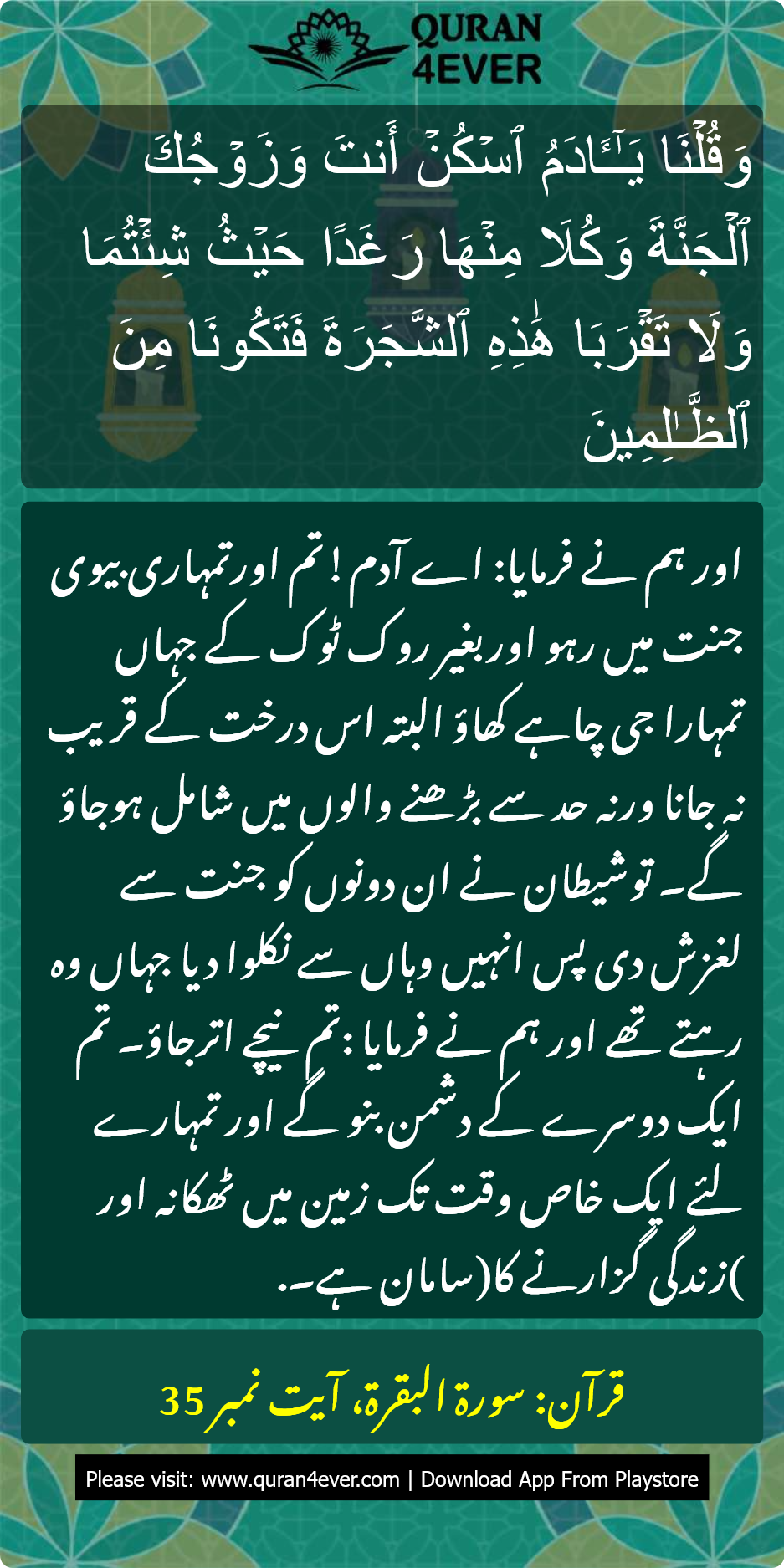 ترجمہ: اور ہم نے فرمایا: اے آدم!تم اورتمہاری بیوی جنت میں رہو اوربغیر روک ٹوک کے جہاں تمہارا جی چاہے کھاؤ البتہ اس درخت کے قریب نہ جانا ورنہ حد سے بڑھنے والوں میں شامل ہوجاؤ گے۔ توشیطان نے ان دونوں کو جنت سے لغزش دی پس انہیں وہاں سے نکلوا دیا جہاں وہ رہتے تھے اور ہم نے فرمایا :تم نیچے اترجاؤ۔ تم ایک دوسرے کے دشمن بنو گے اور تمہارے لئے ایک خاص وقت تک زمین میں ٹھکانہ اور (زندگی گزارنے کا)سامان ہے۔